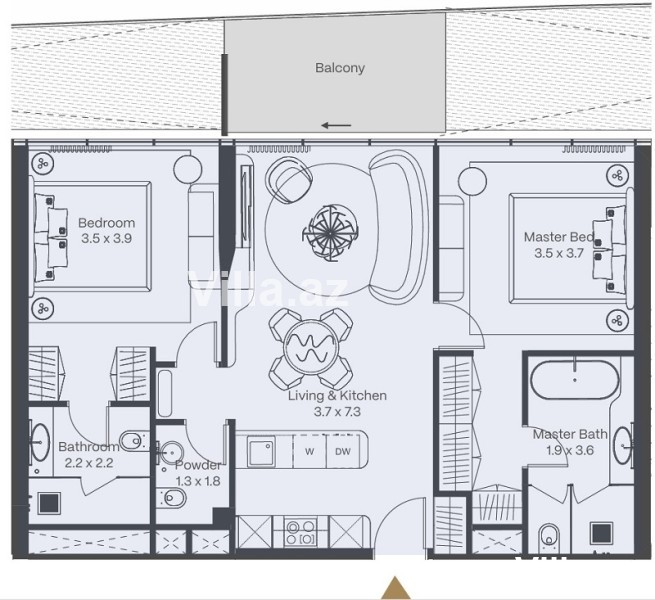 Geniş Living & Kitchen zonası (3.7 x 7.3) – açıq mətbəx və rahat qonaq otağı